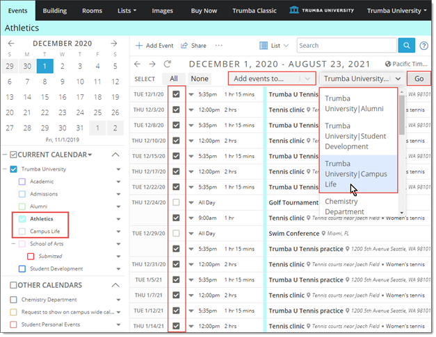 In the following example, we've selected all the tennis-related events on the Athletics calendar, then the Add events to command to also show them on the Campus Life calendar.