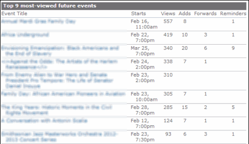 For each event, you can also see how many times visitors have added the event to their personal calendars, forwarded the events to friends, and set event reminders.